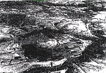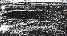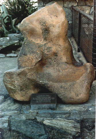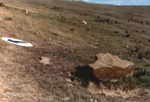 [5/4p] Rys. C13c. Przyklady kamieni ceramicznych. (c) Kamien z Coal Creek kolo Roxburgh. Ten kamien zostal w jakims celu podniesiony przez UFO, oraz porzucony nieco pod gore od miejsca w ktorym oryginalnie spoczywal. UFO jakie go podnioslo pozostawilo po sobie wyrazne wypalony okrag trawy widoczny na tym zdjeciu.