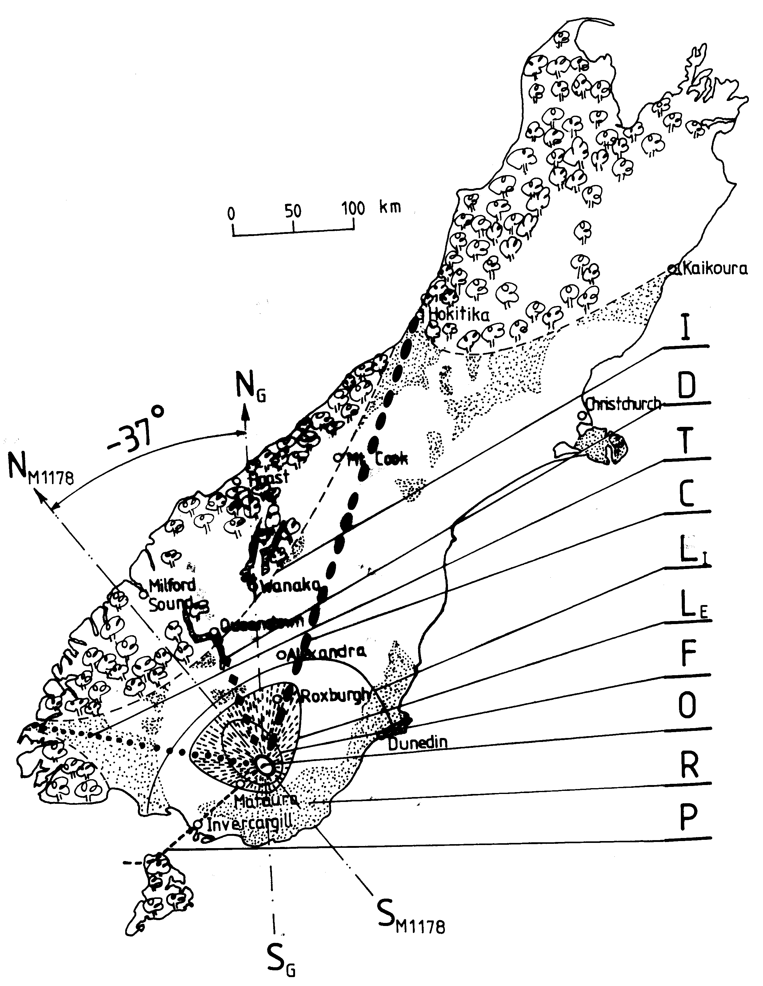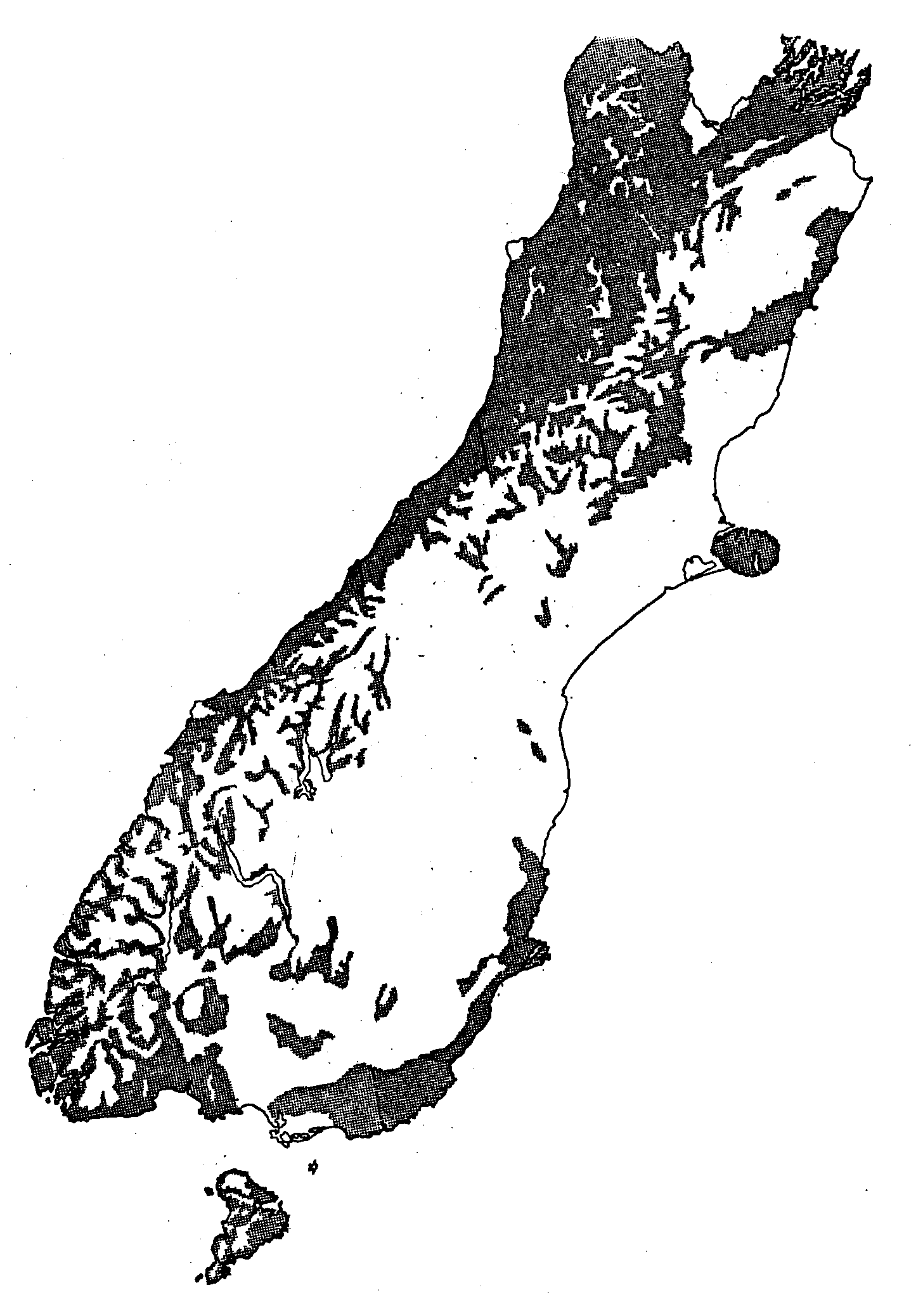 [5/3e] Figure 10: The area of the South Island of New Zealand which was covered by indigenous forest in 1840 (white area = no forest!). It indicates that the Tapanui explosion burned out permanently almost the entire centre of the South Island, disallowing forest to regerminate.