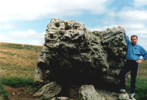 [5/3e] Figure 15 (a): Me (Dr Jan Pajak) near a huge "China Stone" by the Tapanui Crater. This stone still has smoke melted into its surface.