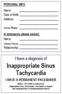 | Click Here for PDF version Personal Medical Information Card with PACEMAKER information A6 Postcard (folded in half) with space to contain your medical information, meds list, allergies, etc. Has information on the back on IST for medical professionals. This card is suitable for you if you have a Permanent Pacemaker. Suitable to keep in your bag or wallet. |
