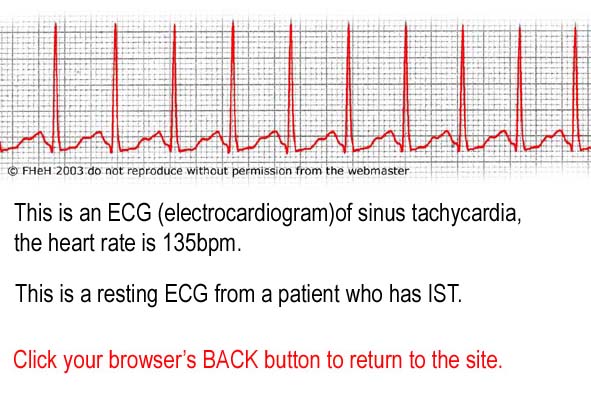 How is IST Diagnosed? There are no universal 'diagnosis criteria' for IST. Instead, there are 'guidelines' which are generally adhered to by Electrophysiologists 1 : A) Documenting IST on : - ECG for resting Heart Rate - resting Heart Rate generally must exceed 100bpm - 24hr ECG / Holter Recording - the mean heart rate during 24 hours should be > 95bpm - Exercise / Stress Test - demonstrate an inappropriate heart rate response to exercise B) Symptoms are documented to be due to tachycardia C) Other causes of a sinus tachycardia must be excluded D) An EP Study to exclude another type of arrhythmia called an atrial tachycardia In practice - an EP Study is most often not performed before an IST diagnosis is made Tests used in the diagnosis of IST > click picture for more information on this ECG of sinus tachycardia |