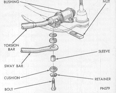 All F/J/M Body Mopars share the transverse torsion bar setup. The bar is anchored opposite the the affected wheel and runs parallel across the K-member through a "Pivot cushion bushing", turns and continues to the lower control arm.