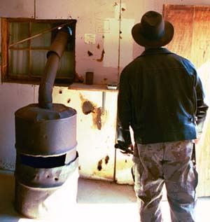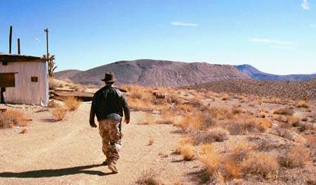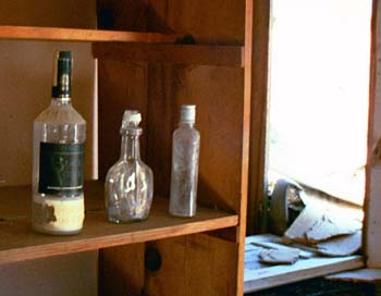 | MK approaches the old shack carefully. The silence of the desert lent an eerie feeling to the whole excursion. Below left: MK reads some markings on the wall of the abandoned shack next to an old stove. Below right: A shelf is home to an abandoned bottle of Black Velvet Whiskey. |