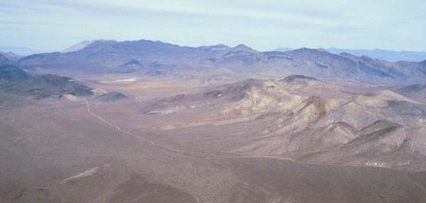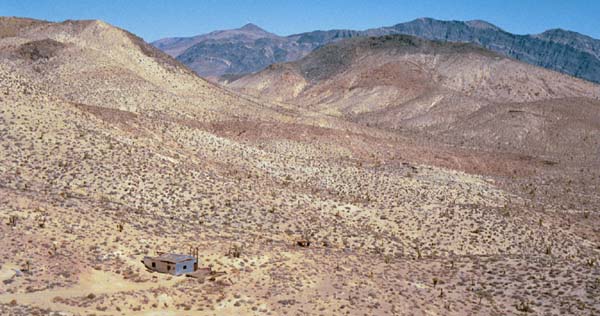 | Once in Death Valley, we found another uncharted trail and explored it into the hills over treacherous terrain. When we broke through into an adjacent valley, we saw this abandoned mining camp below. Our curiosity was peaked, as was our caution... |
