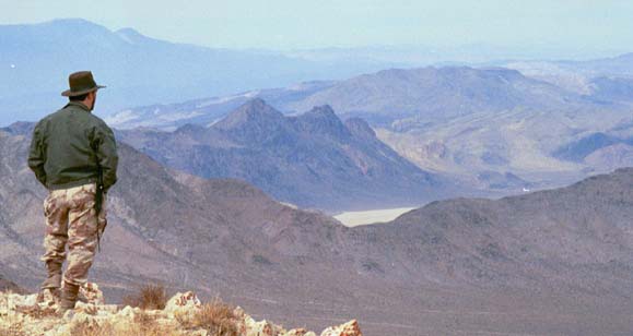 | That afternoon, while exploring an uncharted path, our expedition happened upon an amazing view of Death Valley from an adjacent mountain peak. Above: MK takes in the amazing view of the pure landscape below in the midst of the desert silence. |