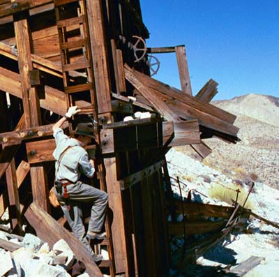 | A large mining rig dominated the area around the talc mine site. Below, I attempt to climb up the wooden beast. |