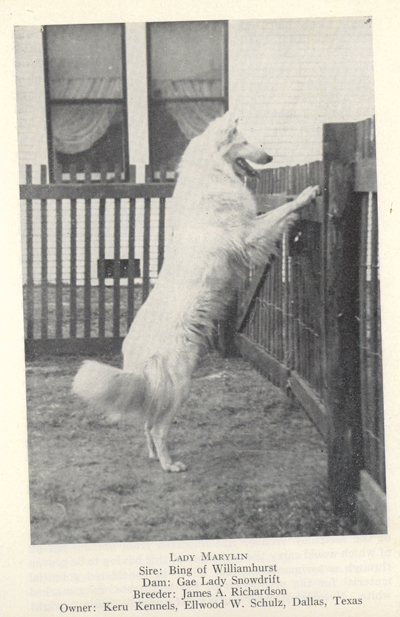 | Lady Marylin Sire: Bling of Williamhurst Dam: Gae Lady of Snowdrift Breeder: James A. Richardson Owner: Kera Kennels, Ellword W. Schulz, Dallas, Texas |