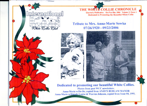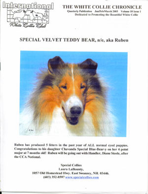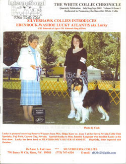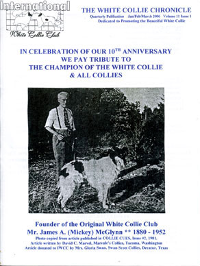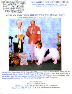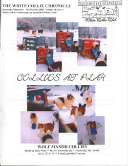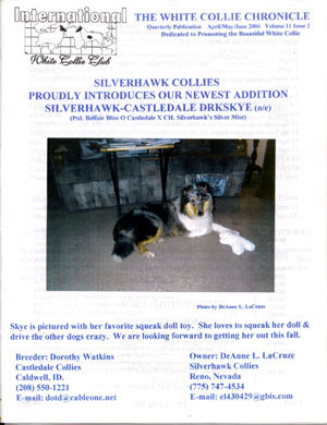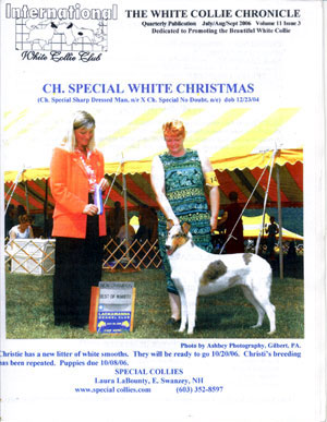 | The White Collie Chronicle Newsletter has back issues available for your viewing and learning pleasure. International White Collie Club promotes the beautiful White Collie through this excellent and very informative magazine. Issues are available at a cost of $5.00 each. Make payments payable to: DeAnne L. LaCruze 790 Barry M Circle Reno, NV 89503 Fax orders to: (775) 746-4438 |