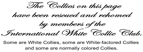 | Visit us again soon. I have more photos for this page. Watch for 'Marty', another of Jan's rescued dogs. He is a handsome Sable-headed White Collie. |