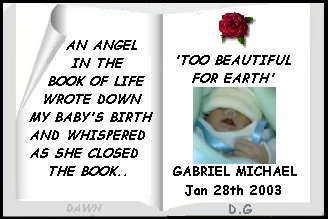 This website is dedicated to our son, Gabriel who was born with anencephaly and didn't get a chance to survive. You will also learn how to prevent other babies being born like him, and can also promote awareness. Please visit all of our angel's pages, read our story, see his photos and read some poems dedicated to him. There are also links that you may visit if you want to learn how to help, or to learn about anencephalic babies. If you are here because you suffered or are suffering the loss of a child this way, God bless you, and please feel free to e-mail me from this website. Please sign our guestbook so we know you were here and come visit us again. |