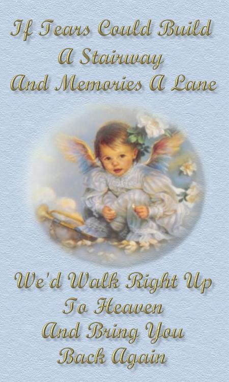 | No heartache compares with the death of one small child, God knows how much we need them, and so He takes but few, To make His land of Heaven more beautiful to view, So when a little child departs, we who are left behind, Must realize God loves children. ANGELS ARE HARD TO FIND! |