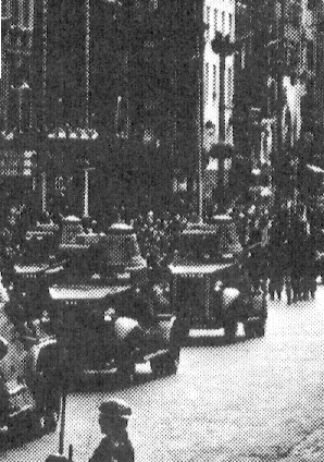 | After it became apparent in 1941 that it would not be possible to procure anymore Landsverk L180 Armoured Cars it was decided to produce a heavy Armoured Car in Ireland. The result was the 4x2 Dodge Heavy Armoured Car designed by Col. J. V. Lawless and Comdt. A. W. Mayne and built by Thos. Thompson of Carlow. The chassis used was from a Dodge TF-37 truck with a 160 inch wheelbase reduced to 135 inches. Five trucks, registration nos. ZC 9483 to 9487 inclusive) were withdrawn from S&T use and supplied to Thompsons for the fitting of armoured bodies. In appearance it looked like a cross between a Ford and a Landsverk with the hull modelled on the Ford and the turret on the Landsverk, although lacking the optical sights. Karl Martin points out one advantage the Dodge had over the Landsverk and Leyland cars, in that being smaller, they were more manoeuvrable on smaller roads. In total 5 were built in two variants, the Mk VII and the Mk VIII, the differences being the armnament, with the Mk VII mounting both a Madsen 20 mm Cannon and a Madsen .303 in MG (though some reports state that the .303 was a Vickers) and the Mk VIII mounting a Vickers .5 in water-cooled HMG and a Vickers .303 in. water-cooled MG. The Dodge armoured cars served with the 1st Armoured Squadron from their delivery in late-1942/early-1943 until withdrawn from use and disposed of. It appears that they were actually withdrawn from use in the 1950s, however their date of disposal varies upon the report, Sgt. D. A. Canavan writing in An Cosantoir (January 1976) puts disposal as the 1950s, while Karl Martin puts it at 1962. Apparently the Dodge Armoured Cars were expensive to maintain and performance must have been inferior to other vehicles available or in service. It is unclear why, when a decision was made to build further heavy armoured cars, that the Leyland model was not used as they seem to have been quite a successful design. In the photograph above (printed in reverse - mirror image, correct image to follow), if studied closely, it appears that the 2 leading cars are Mk VIIs (the 20 mm cannon is just about visable) and the 2 following are Mk VIIIs. It is extremely difficult to obtain photos of and/or information on the Dodge Armoured Cars, so if anyone has some and would be willing to allow it to be placed on this site please forward it to the address on the Home page. |