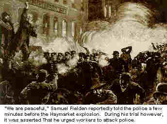 management and government. THE HAYMARKET AFFAIR Probably no single event has done more to influence the history of labor in the United States and even the world. It all began with a simple rally on May 4th, 1886, but the consequences are still being felt today. To understand what happened in Haymarket Square in Chicago on May 4, 1886 it's necessary to go back to the fall of 1884 when the Federation of Trades and Labor Unions (FOTLU), the predecesor to the AF of L met in Chicago and called for May 1, 1886 to be the beginning of a nationwide strike for the eight hour day. This was not a particularly radical idea since the stae of Illinois and Federal employees were supposed to be covered by an eight-hour-day law since 1867. The problem was that the federal government failed to enforce it's own law and, in Illinois, employers forced workers to sign waivers of the law as conditions of employment. With two years to plan, organized labor in Chicago and throughout the nation sent out questionaires to employers to see how they felt about shorter hours, piecework, child labor, and other issues. Although perhaps a simplistic solution to unemployment and low wages, the "Eight-Hour-Day-Movement" caught the imagination of workers across the country. In 1886 the city of Chicago had one of the strongest labor movements in the country. Chicago had a large German population and many of them had been socialists in the old country. Also, many Chicago workers had fled the eastern cities when their unions were broken and they were "black listed." Once in Chicago they were ready to fight rather than move again. On Saturday, May 1, 1886, reportedly 80.000 workers marched up Chicago's Michigan Avenue, arm-in-arm, singing and carrying the banners of their unions. The unions most strongly represented were the building trades, and among themcertainly were the Bridge Builders Mutual Association and various ethnic iron worker unions of that day. This solidarity shocked some employers, who feared a workers revolution, while others quickly signed agreements for shorter hours at the same pay.