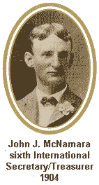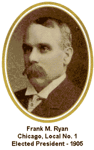 Frank M. Ryan of Local No. 1 in Chicago, Illinois was elected to replace Frank Buchanan as General President and John J. McNamara was reelected as Secretary/Treasurer. The Convention indeed became one of the most significant bodies in the short history of our organization. Shortly after accepting the decision of President Buchanan not to seek further office, the delegates proceeded to practically tie the new officers hands. In endorsing a national strike against the large steel companies the delegates also adopted a resolution which contained a clause that instructed the International Officers "not to call this strike off until every existing grievance is settled satisfactorily to our affiliated locals." This inflexible resolution made it virtually impossible for International Officers to negotiate for a fair settlement of the issues that brought about the strike. It was after this Convention that the International started issuing membership books made of a "cloth" fiber that was resistant to the deteriorating effects of heat and sweat. President Ryan and McNamara ran into difficulties immediately after assuming office in 1905. Ryan and American Bridge's S. P. Mitchell discussed the strike then in progress. Mitchell offered to employ only Union Ironworkers on American Bridge's own erection work, but would not give that guarantee for work sub-let by American Bridge. Ryan decided to strike all jobs considered to have been sub-let by American Bridge. In his hometown of Chicago, he wanted work stopped on two jobs and the majority of local No. 1 members agreed. Frank Buchanan was one of the dissenters. Cleveland Local No. 17 refused to call off its members from jobs sub-let by American Bridge and McNamara caused his own local to be temporarily suspended. Ryan also ran into trouble over the Tube Mill job being erected Non-union, by National Tube Company, at McKeesport, Pennsylvania, within the jurisdiction of Pittsburgh, local 3. National Tube and American Bridge were both subsidiaries of U. S. Steel Corporation; however, the Unions few friends at American Bridge couldn't order National Tube to use union Ironworkers. Such interference being contrary to the parent company's established policy. Local No. 3 officers were adamant in their demand for union Ironworkers on the Tube Mill job, however the work continued non-union. The American Bridge Company President, August Zeising, decided to make Ryan an offer he couldn't refuse. In the presence of U. S. Steel officials, Ziesing proposed to Ryan that his company would use union Ironworkers exclusively on direct contract work and work done under sub-contract. He did not offer a signed agreement, but would put his offer in writing to employ union men for the uniform number of hours for the recognized wages. The Union would have to waive its claim to the Tube Mill work at McKeesport. President Ryan tried to convince Local No. 3 to change its position on the Tube Mill job. The Local Officials wouldn't budge. Ryan decided he then had to turn down American Bridge's offer, since the Local wouldn't waive its claim. (In an interview in 1915 Sam Gompers said"....this mistake was one of the three most costly blunders made in recent years in the American Labor Movement.")