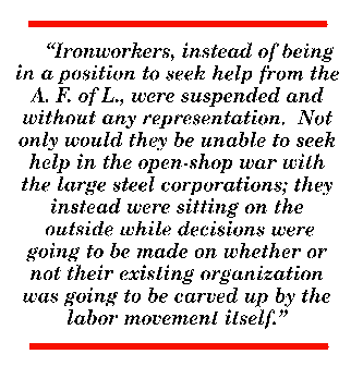 SUSPENSION of the As pointed out previously, the title of the Association was changed to the "International Association of Bridge, Structural and Ornamental Iron Workers and Pile Drivers" in 1914. This title eventually led to the Iron Workers temporary suspension from the American Federation of Labor and the Building Trades Department. Indeed, the change in title threatened the Iron Workers existence as a union for a brief but crucial period. As the A. F. of L. moved into the second decade of this century, it was still a relatively young organization, slightly over thirty years of age. It was exclusively made up of craft and trade unions. That is, each national or international union affiliated with the A. F. of L. was made up of local unions with a membership which followed a particular trade or a specific craft. There were no such things as industrial unions, as we know them today. This was also a time of rapid technological change and industrial growth. During this period, the A. F. of L. granted individual charters to each International as they were created by a group of local unions getting together. Various Iron Worker local unions did this very thing in 1896. The A. F. of L. also followed another procedure of granting charters to independent local unions in anticipation. at some later time, of merging such independent unions into the appropriate international union or to create a new international union from a group of independently chartered local unions. The A. F. of L., in granting charters of affiliation to the international unions, specifically spelled out in the charter grant what work the members of that international union performed by way of their trade or craft. Such identification or charter grant became commonly known as the work jurisdiction of the particular union. In granting charters, the A. F. of L. paid particular attention, as best it could, to drawing lines of demarcation so that no two international unions were granted a charter covering similar jurisdiction. The object, of course, was to stabilize and develop uniformity in wage rates and working conditions for people who followed the same trade or craft.