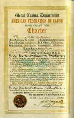 The committee worked long hours and diligently for two straight weeks and the new constitution was approved and adopted on February 7, 1921. General President Morrin sought broader powers for the General President as the Union's leader and a central role for the General Executive Board. He got both. He knew it was essential to have a potent International headed by a strong General President instead a loose confederation of local unions and a limited General Presidency, if the Union was to succeed in organizing the non-union Ironworkers and to stake out its proper place in the construction industry. President Morrin hailed the new Constitution as a great benefit to the union; the addition of three General Vice Presidents, a trimmed Executive Board, International approval of local agreements and work rules and tightening relationships with local unions by writing a uniform constitution for all locals, among other provisions. In 1921 a brief economic collapse resulted in a loss of 5,000 Ironworker's jobs. If the Iron Workers were in a desperate situation in 1921, their foes certainly were not. That same year nearly 200 open shop associations met in Chicago and renamed their drive to crush the unions "The American Plan" (Similar to the "Right-to-Work" committee of today). Their motto read: