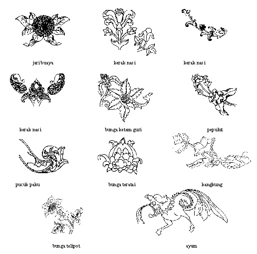 Komponen bangunan dan kraf ukiran kayu Melayu boleh diklasifikasi kepada empat jenis termasuk senjata, komponen bangunan dan perahu, peralatan harian, dan peralatan musik (Ismail Said, 2000). Ianya diukir bermotif bentuk flora (tumbuhan), haiwan, khat, geometrik dan elemen kosmos. Contoh motif flora yang diketemui dari penyelidikan dijelaskan dalam rajah 1.0. Ukiran Melayu dibentuk dalam tiga jenis rupa sobekan iaitu tebuk timbul, tebuk tembus dan gabungan tebuk timbul dan tembus semenjak awal abad ke-14. Kehalusan ukiran atau saiz bunga ukir dipengaruhi oleh jenis komponen bangunan atau kraf. Ukiran berbunga kasar diterap pada komponen rumah seperti daun pintu, sisir angin, buah buton dan dinding. Bunga ukiran yang halus dan rumit disobek pada kraf kecil terutama hulu senjata, acuan putu, cepu, kotak rokok dan perabot rumah. Motif yang serupa digunapakai pada sobekan kasar dan halus. Sobekan bermotif flora mendominasi bunga ukiran pada komponen bangunan dan kraf di negeri Kelantan, Terengganu dan Negeri Sembilan.