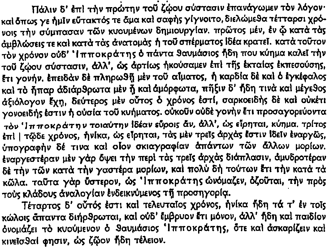 But let us take the account back again to the first conformation of the animal, and in order to make our account orderly and clear, let us divide the creation of the foetus overall into four periods of time. The first is that in which. as is seen both in abortions and in dissection, the form of the semen prevails (Arabic nutfah). At this time, Hippocrates too, the all-marvelous, does not yet call the conformation of the animal a foetus; as we heard just now in the case of semen voided in the sixth day, he still calls it semen. But when it has been filled with blood (Arabic alaqa), and heart, brain and liver are still unarticulated and unshaped yet have by now a certain solidarity and considerable size, this is the second period; the substance of the foetus has the form of flesh and no longer the form of semen. Accordingly you would find that Hippocrates too no longer calls such a form semen but, as was said, foetus. The third period follows on this, when, as was said, it is possible to see the three ruling parts clearly and a kind of outline, a silhouette, as it were, of all the other parts (Arabic mugdah). You will see the conformation of the three ruling parts more clearly, that of the parts of the stomach more dimly, and much more still, that of the limbs. Later on they form "twigs", as Hippocrates expressed it, indicating by the term their similarity to branches. The fourth and final period is at the stage when all the parts in the limbs have been differentiated; and at this part Hippocrates the marvelous no longer calls the foetus an embryo only, but already a child, too when he says that it jerks and moves as an animal now fully formed (Arabic `a new creation')....