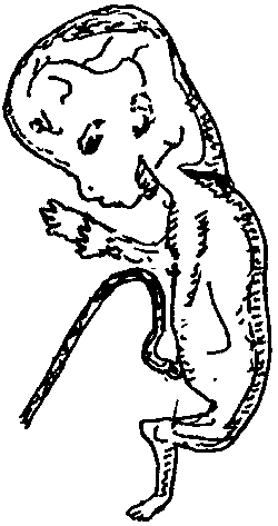 Moving onto the next stage of development, Razi described the mugdah as being a little piece of meat the size of what a man can chew. The idea that mugdah means chewed flesh is a later, and less accurate translation of the word, but the idea has persisted because it is claimed that the somites from which the backbone and other trunk structures develop bear a passing resemblance to teeth marks implanted in plastercine. It must be said that not only is this an imaginative interpretation however, but besides, Moore cannot claim that the mugdah should occur at 26-27 days since at that point the embryo is a mere 4mm long. One would have to wait around 8 weeks before the embryo was the size of chewed flesh (if a mouthful is defined as being 20-30mm wide), which is what mugdah really means. And in the following Hadith, transmitted by Bukhari and Muslim, Muhammed claims that the mugdah stage occurs between days 80 and 120. Yet by this time the foetus is considerably larger than a lump of flesh the size of which a man can chew, and looks very human-like and totally unlike meat.