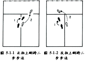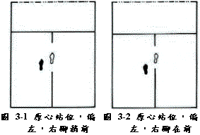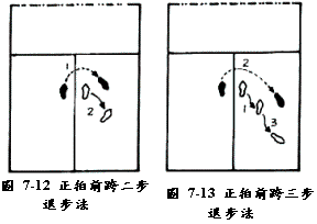 正拍後退步法,國內有些選手以前跨二步退(圖7-12)與前跨三步退(圖7-13),這是較不好的步法,因為在前跨時須扭轉身體增加時間,而且背對對手,是喪失敵情的不利做法,世界級選手也極少為之。
