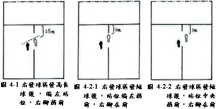 - 後退擊球時右跳左下或右跳右下皆屬攻擊性腳法,應收腹並在腳著地同時,做推蹬地面使重心向前的回位動作,不可使重心往身後落。