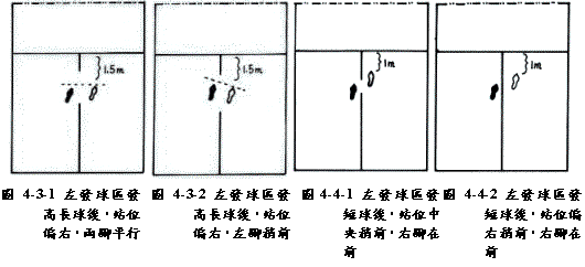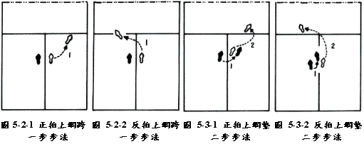 後退的應用步法無法設定由固定位置及腳法出發,故有所變化,但由世界級選手使用率可瞭解:在正拍後退步法中以後跨一步退(圖7-4)、後跨二步退(圖7-5)、後跨三步退及墊二步退(圖7-6)等步法為主要使用步法,而其他步法因使用率較低故不予介紹及採用。在繞頭後退步法