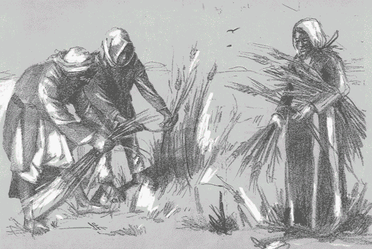Spikes Gathers Poor women gather the remaining of ears left by the croppers. In the blaze of the burning sun, they carry their modest crop and gather it in pile and heaps to be beaten with sticks. |