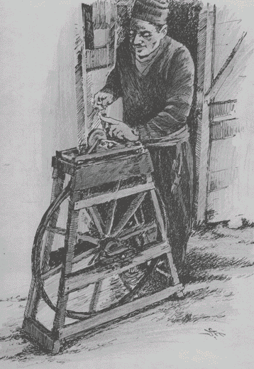 The Knife Sharpener He uses the wheel stone to sharpen scissors and strop knives |
