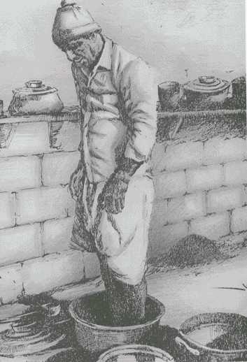 shine, and twinkle .He kneads, rubs, and stumps pots with his strong feet.
