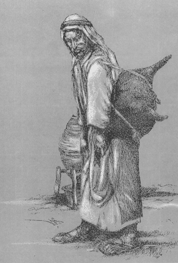 leathery full water skin on his back. He distributed water for few dirhems |