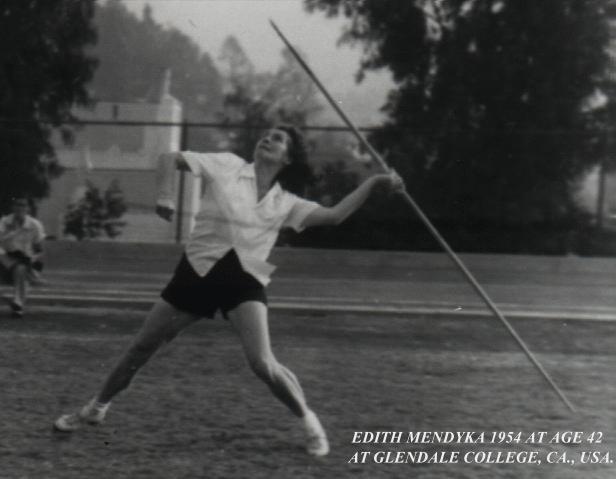 Edith was amazed that there was so little opportunity for women in America in athletics. Edith was part of the group that founded the master's program in California. She won a number of State Javelin titles in California and in 1959 her daughter Karen Mendyka beat her for that title. |
