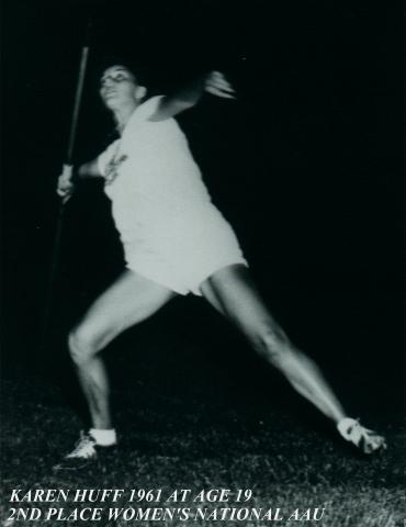 In 1960 Karen won the Girls National title, placed 2nd in the Women's division at the National meet and placed 3rd in the Olympic trials. She missed the qualifying Olympic standard by 9 inches, (standard was 160 ft. 9 1/2 in.) Karen threw 160 ft. 1/2 in. and did not go to Rome. In 1962 Karen won the Wome's Nationals for USA. |