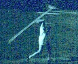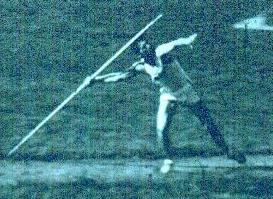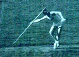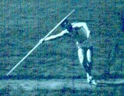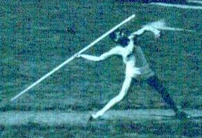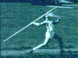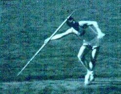 | Franklin "Bud" Held Pictures from 1954. The pictures will never receive any photographic awards but very clearly show two points that nowadays are considered fatal faults, but were key parts of Bud's world record in 1953 and his five world record throws in one night at the Modesto Relays in 1955. Three were measured and Track and Field News credits him with those. Two others were clearly 18-24 inches short of his best that night and were not officially measured. I was watching that night, however, and the 2 unmeasured throws obviously broke the existing record. The sixth throw was a foul. Those points are: 1 Photo 4 shows the right foot lands about twenty degrees back of 90 degrees to the runway. This enables a quick but powerful thrust from the right foot to drive the hip around very strongly. The hip forces the shoulders in to the strong open position and clears the way for a fast, powerful arm pull. 2 Photo 6 shows a deep left knee bend rather than a locked left leg plant. A locked leg retards the body's forward motion while a bent left leg, straightening powerfully, allows the body to continue onward unimpeded and as that left leg straightens into the fully extended position (Photo 7 and missing photo 8), all that speed and momentum is redirected up along the intended flight path. By the time the hand passes over the shoulder, the left leg is fully extended. The photos came from a sixteen millimeter black and white reel that had been store for many years in an unairconditioned Arizona garage. Dick Held |