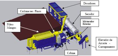 de Asfalto: O equipamento é montado sobre chassi unico novo, compostos de sistema de dosagem e controle do processo; sistema de secagem e mistura, sistema de filtragem e exaustão e sistema de carregamento, conforme visto a seguir: A.1.1)Sistema