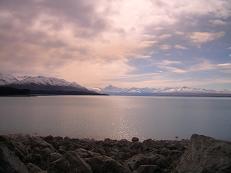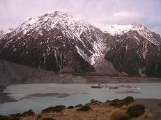 Leaving our nice lodge in Queenstown was a bit difficult, but we managed. After a full breakfast, which included eggs, roasted tomatoes, fresh kiwis and my beloved muesli & yogurt, we were back on the road, heading towards Mt. Cook, the highest peak in all of Australasia. Our first view of the 3755 meter peak came as we rounded Lake Pukaki, a blue-green lake that was carved out by advancing glaciers thousands of years ago. The mountain ranges surrounding Mt. Cook, know as the Southern Alps, have several glaciers imbedded into them, and most of the peaks also reach over 3000 meters high. Mt. Cook, however, sits as a focal point in the middle of the range. The local Maori call it "Aoraki," which translates to "Cloud Piercer." Many of the Maori legends of creation focus on Aoraki, the closest point to the heavens.