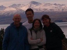 At the Lake Pukaki information center, we stopped off to take in the views of Aoraki reflected in the lake. Interestingly, we bumped into Danny and Angela, a couple from Manchester, England, whom we'd met the day before on our plane trip through Milford Sound, and then earlier on in the morning when we stopped off for gas in a small town just outside of Queenstown! After so many chance encounters, we just had to take a picture with them. They're travelling through New Zealand in a camper van, which comes complete with a big bed, shower, stove and restroom. This might not be the last that we see of them, since we're all going to be ending up in Christchurch by Saturday.