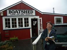 Once we arrived in Rawene, we headed straight for the Boatshed, which Steve had recommended, for a bit of coffee and a break. The quaint and cozy little cafe, which is perched on stilts directly over the water of the bay, makes all of its baked goods on the premises, and even as we were sitting there, the owner was busy making pizza dough and foccacia (to the tune of an Arrested Development CD). We took along with us two fantastic slices of salami and olive pizza, to be savored later in the car.