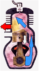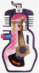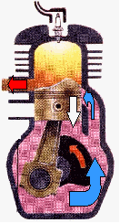 Inmediatamente antes del punto muerto superior se enciende la mezcla y el pistón desciende impulsado hacia abajo. Al descender descubre la lumbrera de escape y permite que los gases quemados salgan al exterior. Al mismo tiempo la parte inferior del pistón actúa como una bomba e impulsa la mezcla de combustible y aire que se encuentra en el cárter hacia la lumbrera de carga, por la que pasa, y llega a la cámara de explosión preparada para entrar en ignición.
