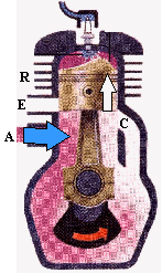 El motor de dos tiempos, al igual que el motor de cuatro tiempos, tiene cilindro, pistón, cigüeñal y bujía, pero carece de válvulas, que son sustituidas por tres o varios orificios llamados lumbreras o ventanas, y que son las lumbreras de escape E, admisión A y carga C, y que están abiertas en la pared del propio cilindro. Se abren y se cierran mediante el mismo pistón cuando efectúa las carreras de admisión-escape y compresión-explosión. El motor de dos tiempos debe completar la admisión, la explosión y el escape en un solo movimiento completo del pistón hacia arriba y hacia abajo.