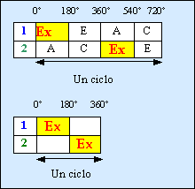 Igualmente, para motores de dos tiempos, donde cada ciclo de funcionamiento se realiza durante un giro de 360° del árbol motor, las muñequillas del cigüeñal deben estar situadas de forma que los encendidos se sucedan con un ángulo de: alfa = 360° / N.