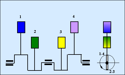 Por tanto, siguiendo el sentido de giro de las muñequillas del cigüeñal, cuando el cilindro número 1 hace la explosión, el número 2 inicia la compresión; al cilindro número 3 le corresponde terminar la compresión y comenzar la explosión y, por último, el cilindro número 4 efectúa el final de la explosión y el principio de la compresión. Según este proceso se obtiene el siguiente orden de encendido: 1-3-2-4