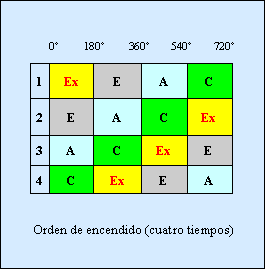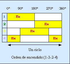 - Orden de encendido. Se sucede con un desfase de ? = 720° / 4 = 180°. El orden de encendido queda determinado según se indica en su diagrama de funcionamiento, y que es: 1-4-3-2.