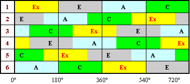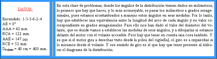 Un motor de explosión de seis cilindros en línea y cuatro tiempos, tiene de orden de encendido 1-5-3-6-2-4, con un avance inicial de 8 grados. Los ángulos de la distribución, medidos en milímetros, son los siguientes: AAA = 42 mm, RCA = 122 mm, AAE = 147 mm; RCE = 52 mm. El motor gira a derechas visto desde la polea del cigüeñal, y tiene un volante de 40 cm. Con estos datos responder a las siguientes preguntas y trabajos:
