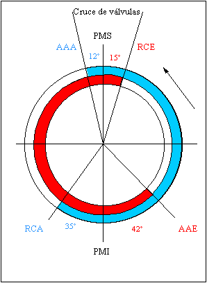2). Es un motor simétrico o asimétrico. Razone la respuesta. Es un motor asimétrico, pues observando los ángulos que forman el solape o cruce de válvulas, que es cuando están abiertas la válvula de admisión (porque está empezando a abrirse AAA) y la de escape (porque está terminando de cerrarse RCE), comprobamos que son desiguales. Si fueran del mismo valor correspondería a un motor llamado "simétrico". Hay que hacer notar que cerca del punto muerto inferior no hay cruce de válvulas, ya que al cerrarse la válvula de admisión (RCA) es cuando comienza la compresión y después la explosión, abriendo el escape a 42º antes del punto muerto inferior hasta que rebasa los 15º después del punto muerto superior. Debido a este ciclo de cuatro tiempos, hace falta dos vueltas del cigüeñal, o del volante, hasta que vuelvan a coincidir las dos válvulas abiertas, que lo hacen precisamente en las cercanías del PMS.