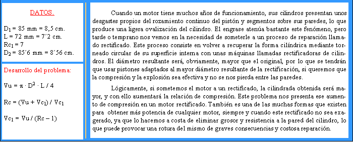 Un motor de explosión tiene de diámetro 85 mm y de carrera 72 mm. Su relación de compresión es de 7:1. Debido al desgaste del cilindro, su diámetro ha sido rectificado hasta obtener una medida de 85´6 mm. Calcular la nueva relación de compresión.