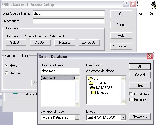 where you have your mdb file in my case d:\tomcat\database\shop.mdb -> Click OK -> OK again -> OK once more