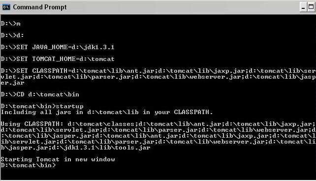 I guess the guys have learnt from their mistakes , so this version is more stable after 3.2.1 and works better 1) Download jakarta-tomcat-4.1.27.exe from the jakarta.apache.org 2) Click on the EXE and install itin C:\Tomcat directory, i prefer this 3) check installation at http://localhost:8080 in your browser u must see the yellow cat 4) Save this file Below as HelloWorld.java in C:\Tomcat\webapps\examples\WEB-INF\classes Directory 5) go to above directory compile the code C:\Tomcat\webapps\examples\WEB-INF\classes\>javac HelloWorld.java if this go fine u wont get any error during compiling 6) In your browser type in http://localhost:8080/examples/servlet/HelloWorld then u will see My Hello World