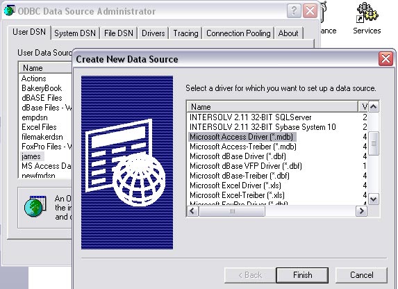Click on Start -> Settings -> Control Panel -> Administrative tools -> Data Sources (ODBC) -> User DSN -> Add -> Microsoft Access Driver *.mdb -> Finish