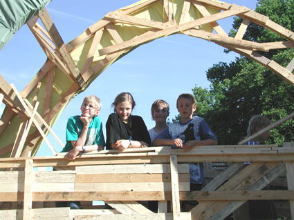 Kiel Week Sailing Regatta 2005 On the wooden bridge where the children are allowed to nail boards to their hearts' delight Torben, Laura, Christian, Lennart 25 June 2005