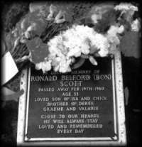 | Bon scott was also an excessive and this would ultimately lead to tradgedy. After a night of heavy drinking, Bon died in the back seat of Aldair Kinnear's car outside of Kinnear's flat in South London, sometime on Feb.19 th. Bon Scott was found by Alidair. Bon was pronounced dead on arrival at Kings College Hospital, Bon now lies in the Fremantle Cemetery's Memorial Garden in Australia. |